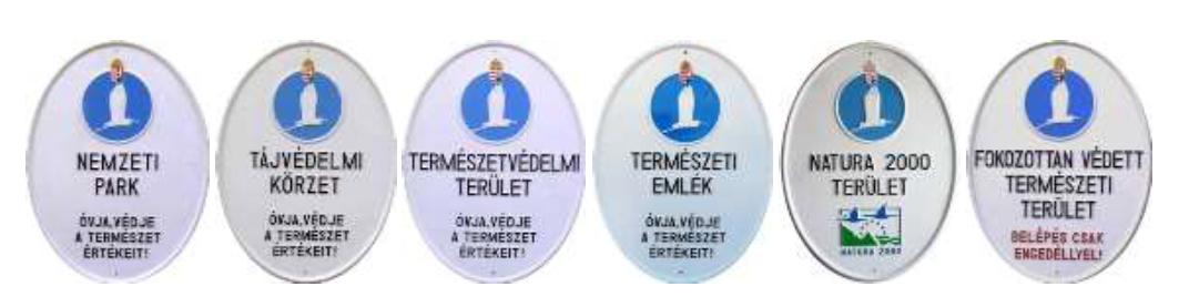 A Tvt. 26. § (1) és 41. § (1) bekezdése alapján a védett természeti területeket és a Natura 2000 területeket a természetvédelmi hatóságnak a természetvédelmi kezelő útján táblával kell megjelölnie. A törvényben előírt és szabványban foglalt természetvédelmi hatósági táblák a fenti ábrákon, a területek elhelyezkedése pedig az alábbi országtérképen és interaktív térképen láthatóak.